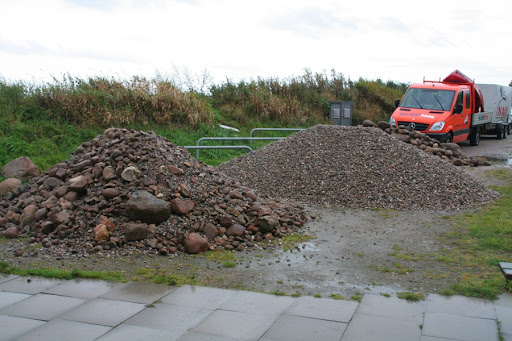 to provide for the 24t anrollten the gravel on Friday at 7:00. However, the part of the larger stones was not what we had imagined, nor was it what was ordered. Therefore, again 10t "big rocks" to order. Thus, from 24t to 34t just moving gravel, better too much than too little. Front of the picture you see the faulted gravel pile in the center of the fine gravel and behind the right stone. As on